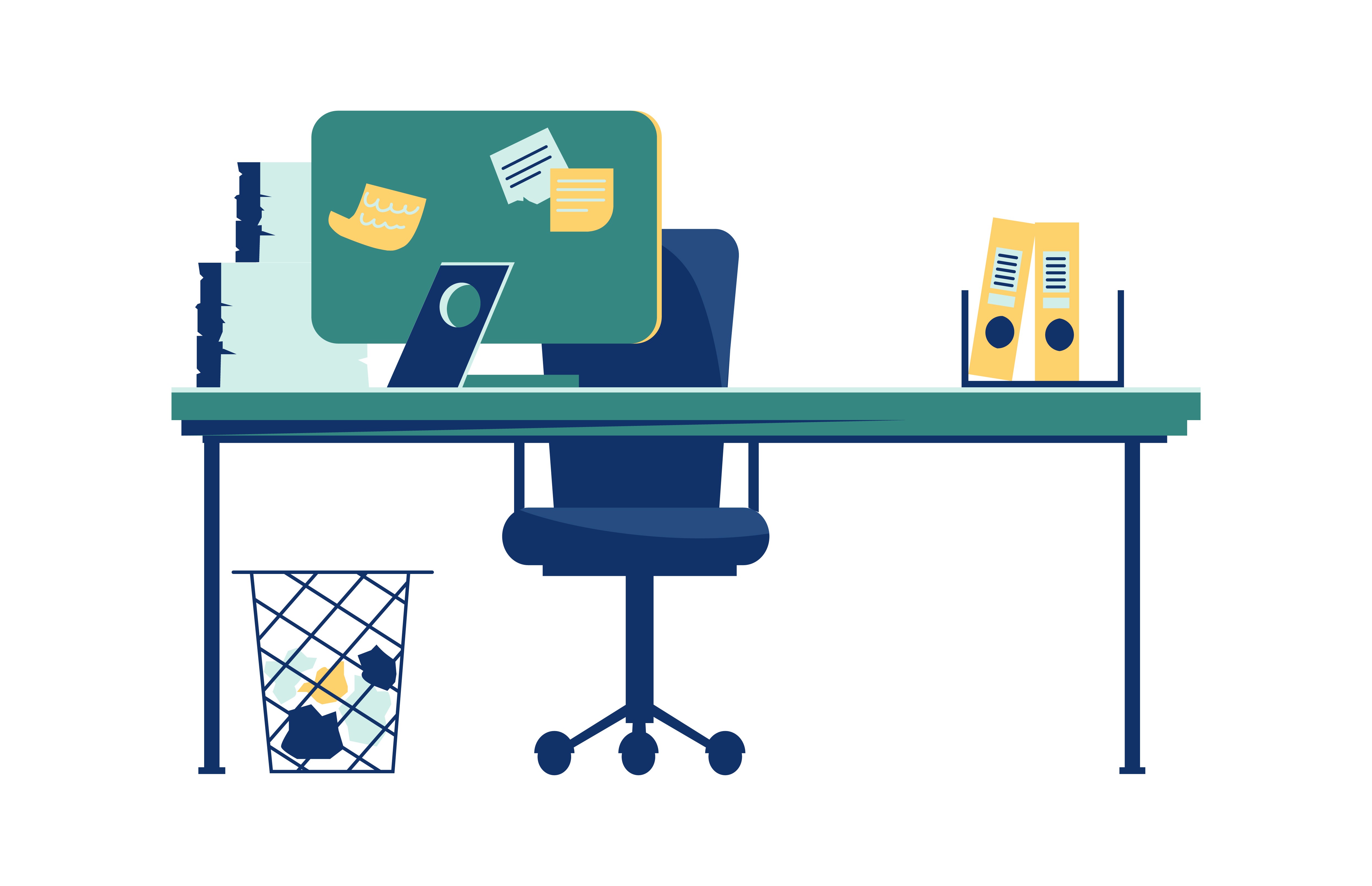 minimal flat office desk illustration with teal green and dark navy blue color palette, clean modern workspace, computer monitor, office chair, folders, simple geometric shapes, vector style, white background, professional design If you want a slightly stronger push toward the exact tone, you can add: flat vector illustration teal green navy blue yellow accents office scene This kind of phrasing nudges the algorithm toward that calm, modern, slightly corporate color mood while keeping results visually consistent.